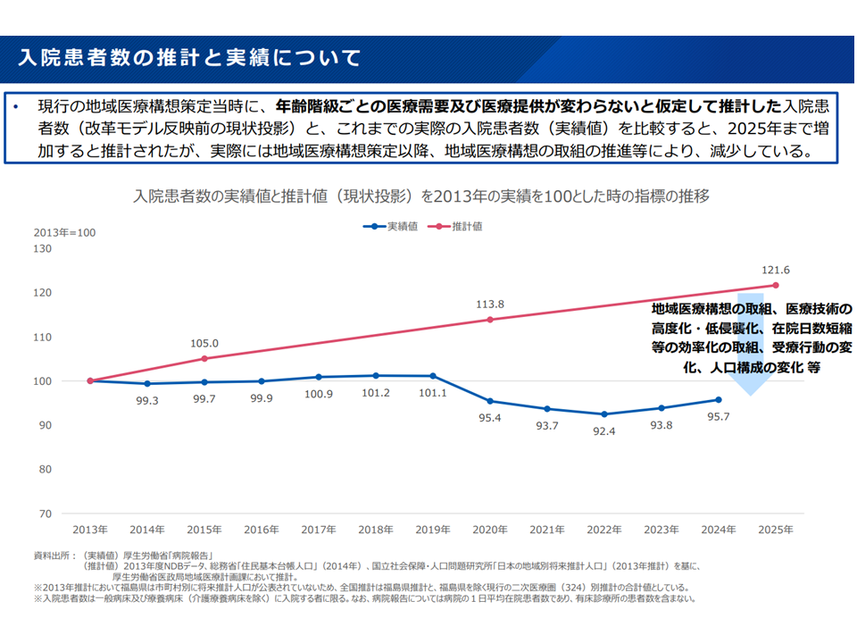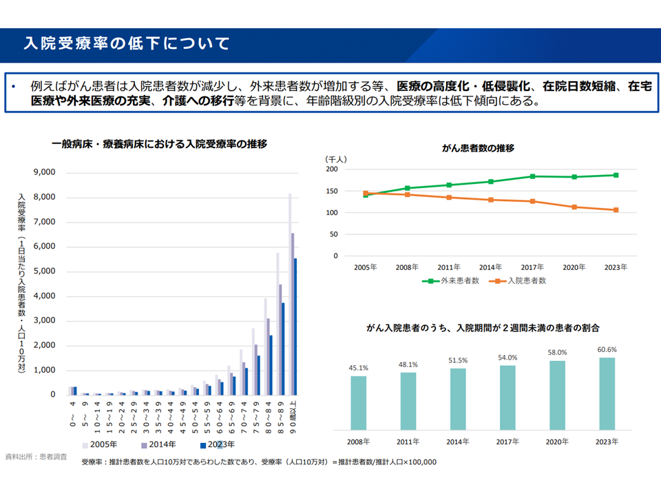 →より早期に集中的な治療を行い「早期退院」を目指す傾向が強くなってきており、当然、在院日数の短縮につながる(結果、延べ患者数は少なくなり、より少ないベッドで医療ニーズに対応できることになる)