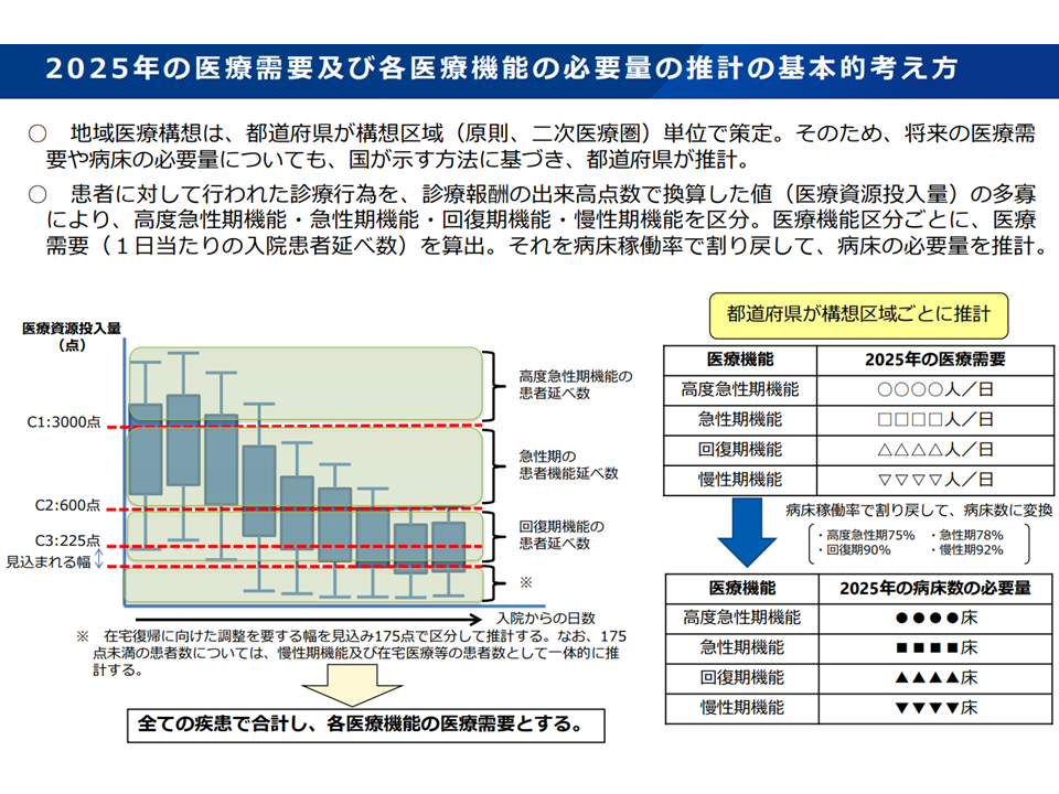 新地域医療構想では、従前と異なり「在院日数の短縮」や「病床機能分化」等の改革モデルを織り込み、より実態に近い必要病床数を設定する—。