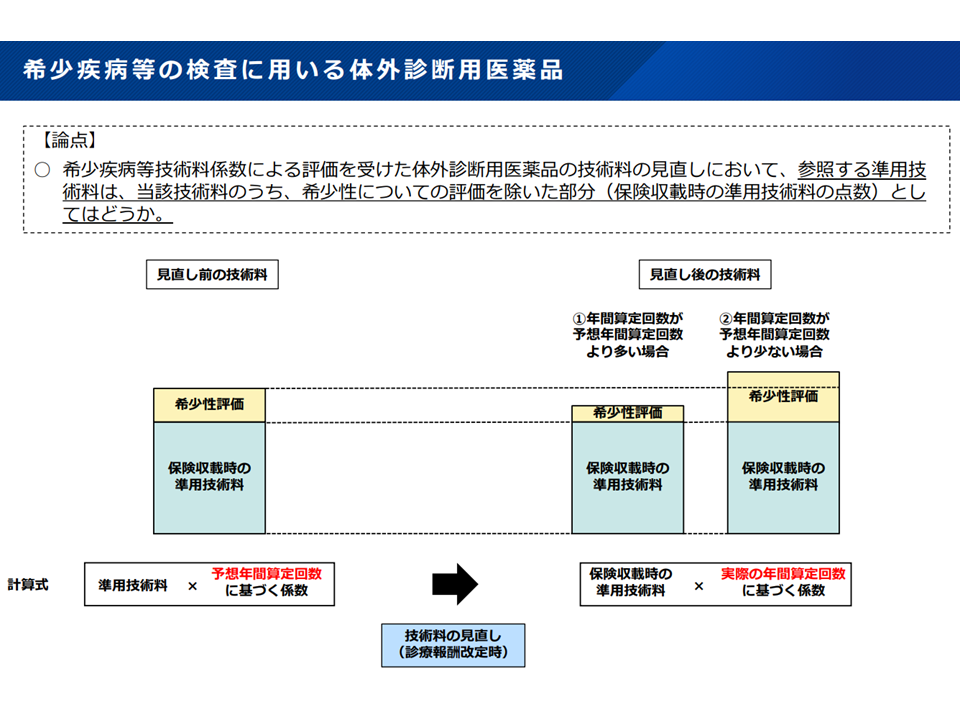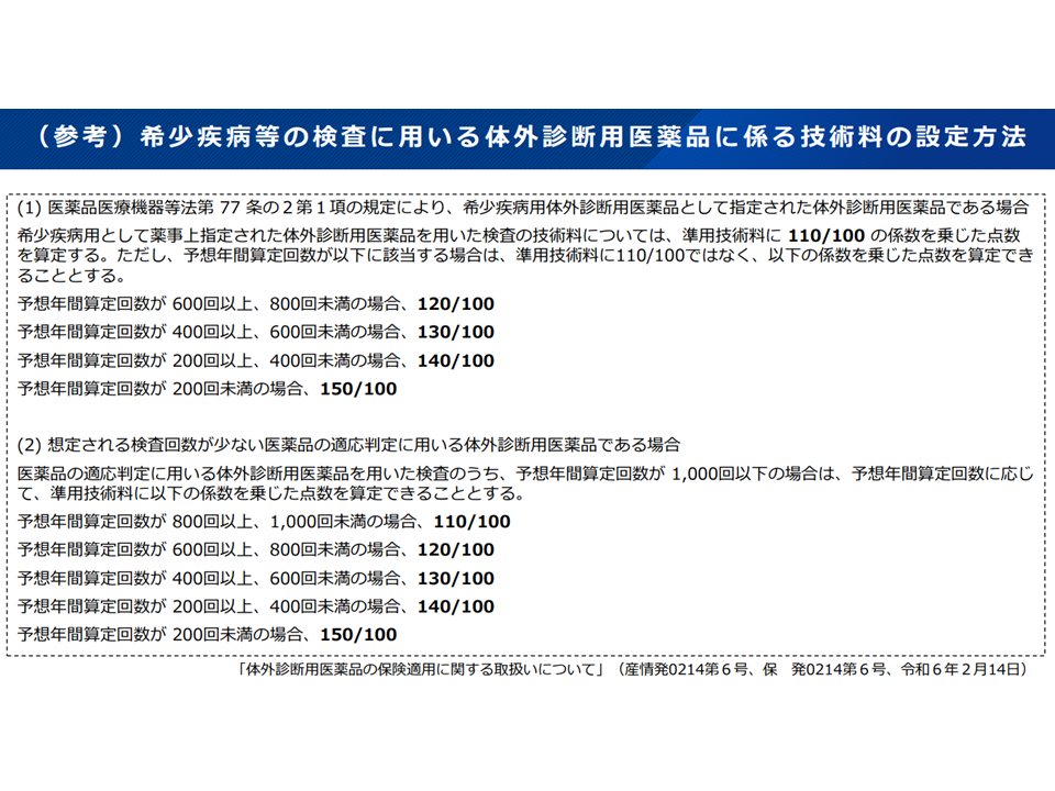 ●2024年度材料価格制度改革で、「希少疾病等の検査に用いるものとして配慮が必要な体外診断用医薬品」の技術料について「予想年間算定回数に基づく係数」(希少疾病等技術料係数)による評価を新設した