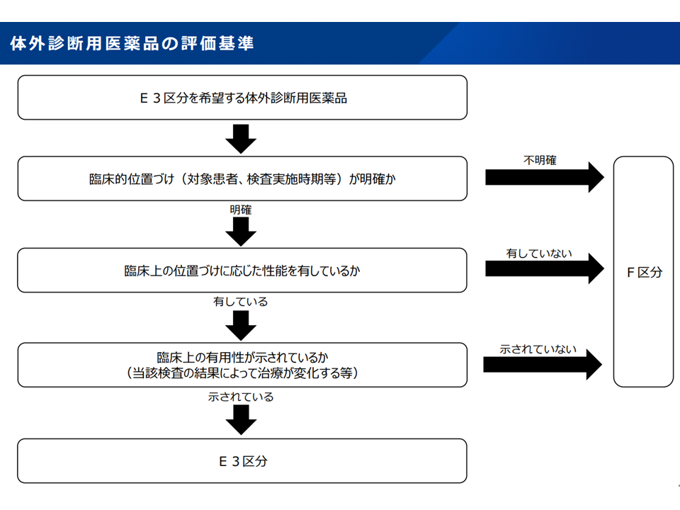 ▽メーカーがE3(新項目、改良項目)による保険適用を希望する体外診断用医薬品について、以下のいずれかに該当すると保険医療材料等専門組織が判断した場合には「F区分」としてはどうか