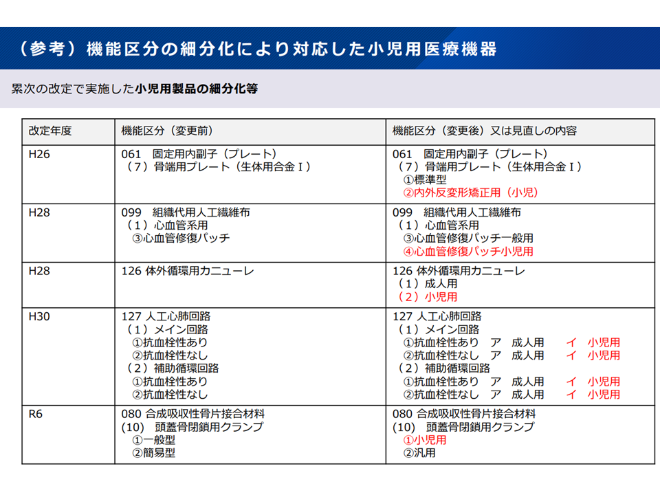 ●小児用医療機器には「対象患者数が少ない」「患者の成長とともに使用するサイズが変わる」などの特性があり、「機能区分の細分化」などで個別対応を行ってきている