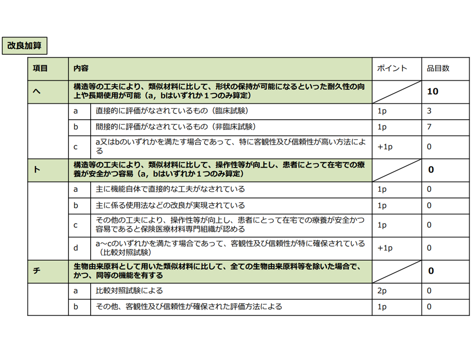 ▽ただし改良加算の▼ロ(類似材料に比べ「使用後の廃棄処分等が環境に及ぼす影響」が小さい)▼ト(構造等の工夫により、類似材料に比べ操作性等が向上し、患者にとって在宅での療養が安全かつ容易)▼チ(生物由来原料として用いた類似材料に比べ、全ての生物由来原料等を除いた場合で、かつ同等の機能を有する)は、該当品目がこれまでに登場しておらず、引き続き「試行案」として該当事例を待ちながら、項目の在り方を検討してはどうか