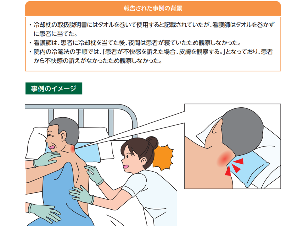 冷却枕を使用する際に「タオルに巻く」などの留意事項に従わなかったため、患者に凍傷が生じてしまう医療事故が散発している(医療安全情報227 251015)