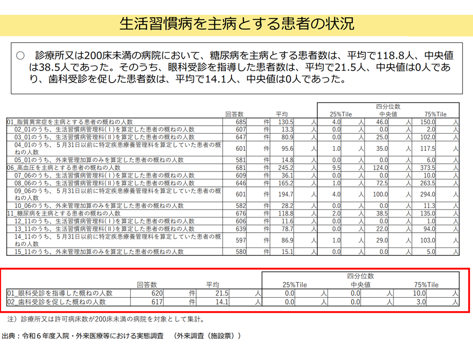 ほか、糖尿病患者の「眼科」「歯科」受診勧奨は十分に行われておらず、「糖尿病網膜症」や「歯周病の重症化」への対応が十分に行えているのか不安な状況も示されています。