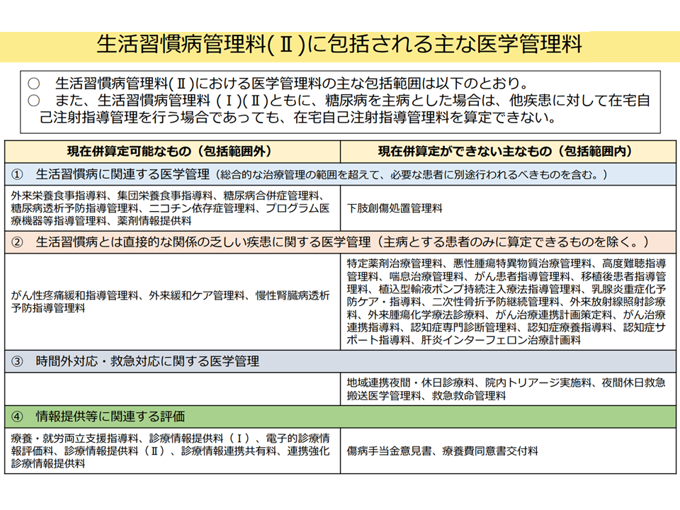 (2)の「生活習慣病管理」については、2024年度の診療報酬改定で、例えば次のような【生活習慣病管理料】などの大きな見直しが行われました。