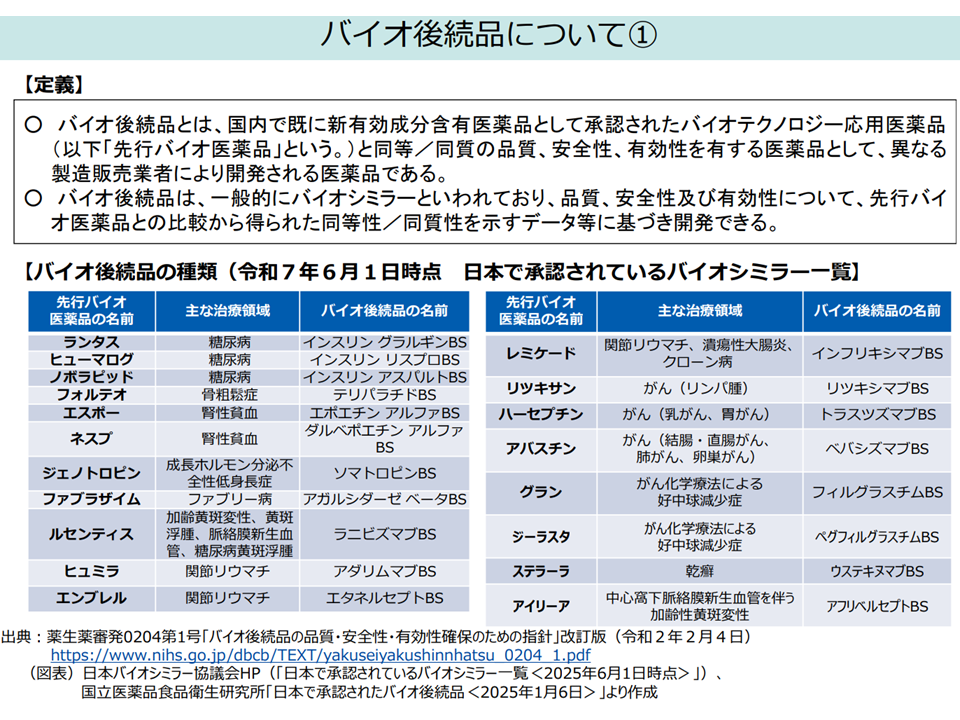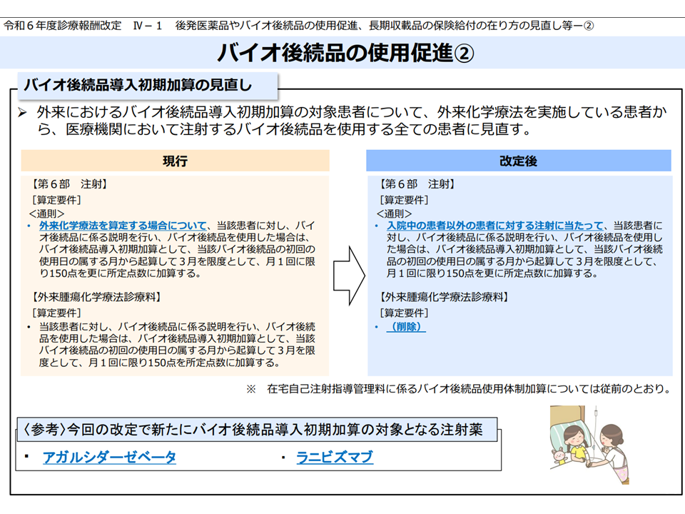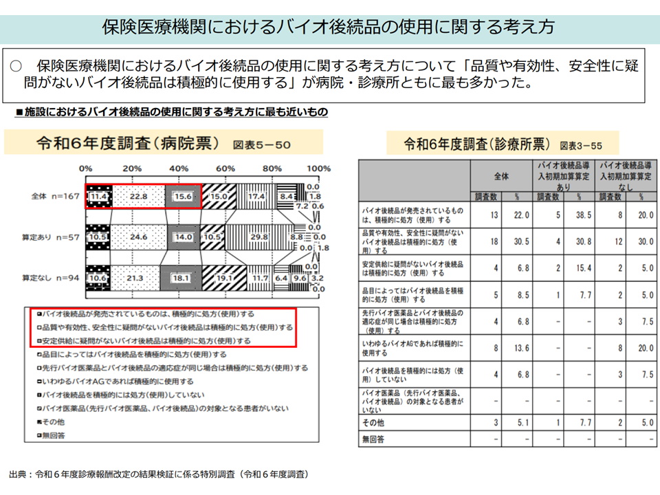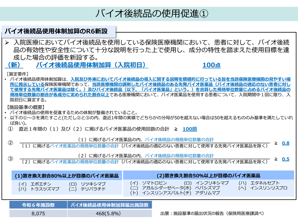 このため2024年度の前回診療報酬改定では▼「患者による後続選択を支援するための医師による説明」負担を評価する(これによりバイオ後続品使用が促進すると期待される)【バイオ後続品使用体制加算】を新設する(入院での評価)▼【バイオ後続品導入初期加算】(外来におけるバイオ後続品選択に資する情報提供を評価する加算)の対象を拡大する—などの対応が行われました。