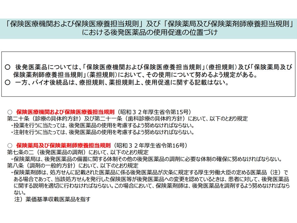 なお、「保険医療機関および保険医療養担当規則」(療担規則)・「保険薬局及び保険薬剤師療養担当規則」(薬担規則)には、医療従事者に「後発品使用促進に努める」旨が明記されており、同様に「バイオ後続品の使用促進に努める」旨の記載を追加することが厚生労働省保険局医療課の清原宏眞薬剤管理官から提案され、診療側・支払側委員共に同意しています。