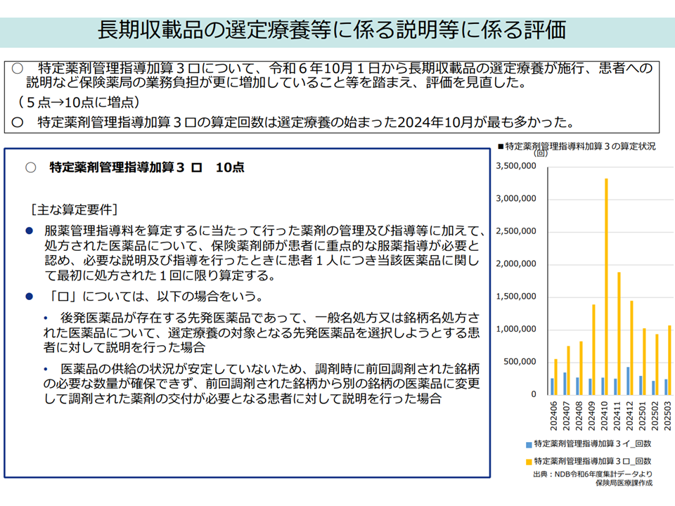 あわせて「選定療養費制度に関する薬局の説明負担」を勘案した【特定薬剤管理指導加算3】(服薬管理指導料の加算)について、「説明するだけで加算取得を認めるべきではない。実際に後発品から長期収載品に変更になった場合に加算取得を認める、あるいは変更を前提として、変更できなかった場合には減算を行う仕組みとすべき」とも進言しています。
