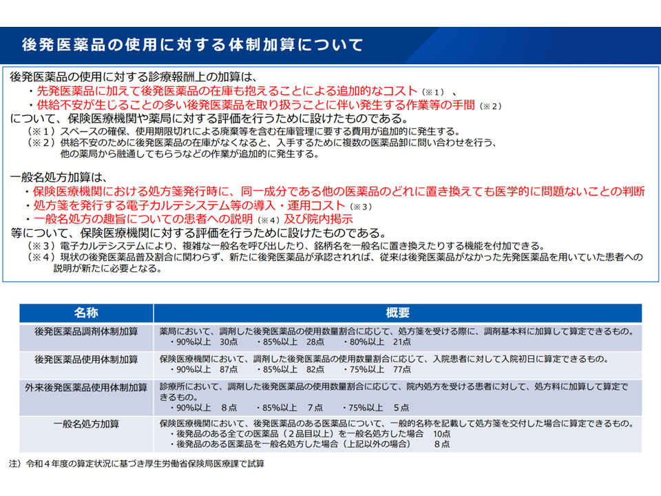 このため医療保険制度改革や医療費適正化の取り組みを続け、「医療費の伸びを、我々国民が負担できる水準に抑える」ことが求められています。診療報酬でもこの点が重要視点の1つとなり(関連記事はこちら)、例えば「後発医薬品の使用促進を評価する加算」(薬局における後発医薬品調剤体制加算、医科入院(病院)における後発医薬品使用体制加算、クリニック(医科外来)における外来後発医薬品使用体制加算、医科全体における一般名処方加算)などが設けられています。いずれも「後発品の使用割合」などを評価し、より多くの後発品使用などとで高い加算の取得が認められるものです。