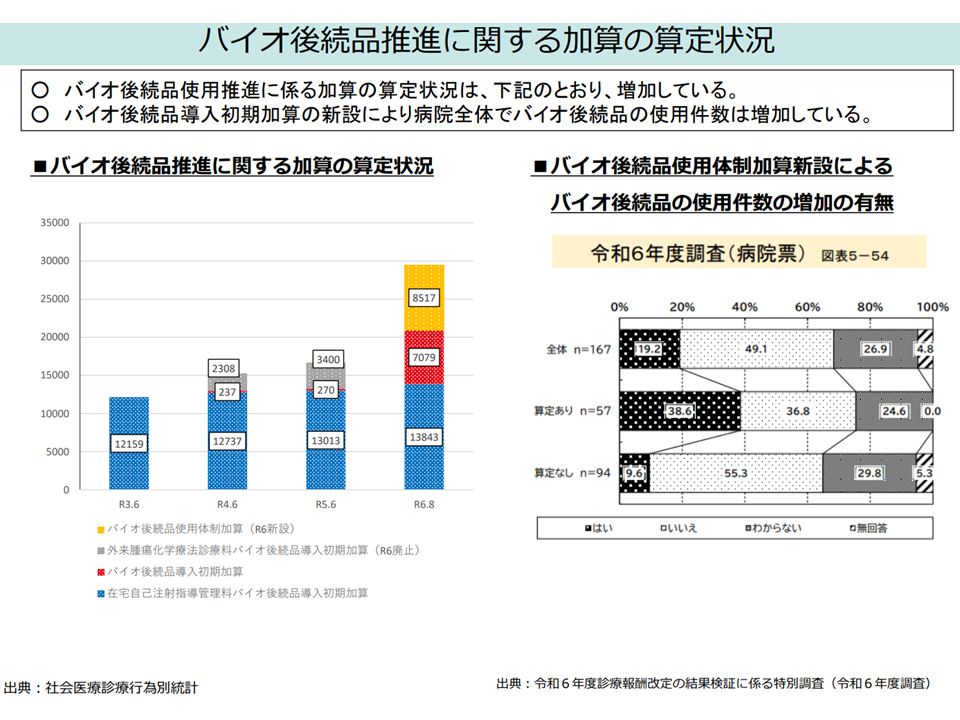 こうした加算の算定は増加傾向にあり、また医療機関への調査からは「さらにバイオ後続品の使用が進んでいく」と予想されます。