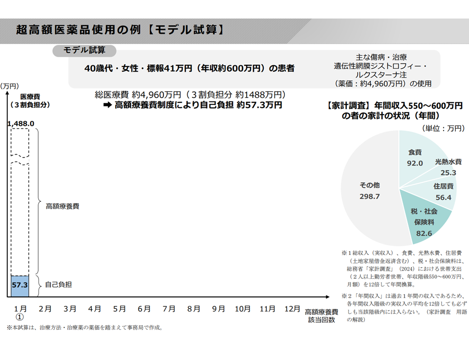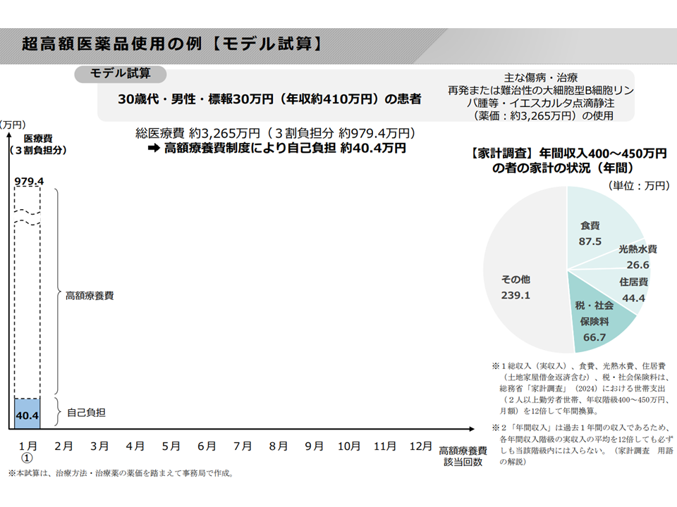 →当該薬剤投与月に高額療養費(年1回)が適用され、「3割負担のままでは年間979万4000円を負担する」ところ、「実際の患者負担では年間40万4000円の負担」(4.1%)となった