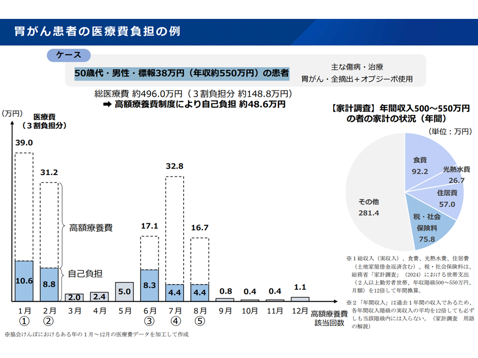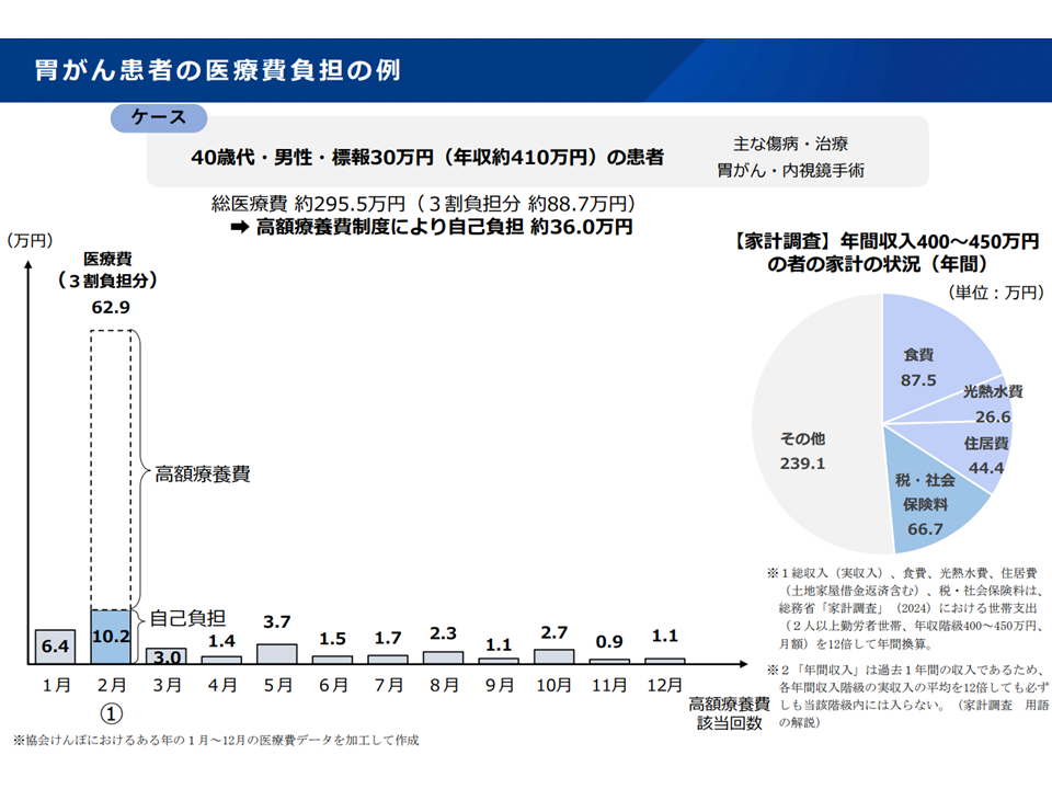 また佐藤保険課長は、次のような協会けんぽ加入者における「高額療養費の適用」例(代表例ではない)をいくつか紹介しています。所得・疾患・治療内容などによって、高額療養費の適用状況は大きく異なり、家計に及ぼす影響にも相当の違いがあることが伺えます。とりわけ「長期間の療養が必要で、毎月、医療費が高くなる」患者では、高額医療費の恩恵を強く受けられることが分かります。ただし、後述するように「低所得者」では、現在の高額療養費制度下でも「家計に占める医療費負担が相当程度重くなる」ことも確認できます。