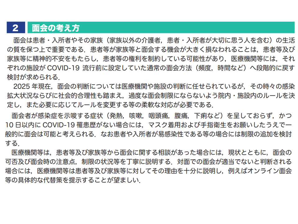 そうした中で今般、日本感染症学会・日本呼吸器学会・日本化学療法学会・日本臨床微生物学会・日本環境感染学会から「5学会による新型コロナウイルス感染症 診療の指針2025」が公表され(2025年10月17日付)、面会の考え方が新たに次のように示されました。