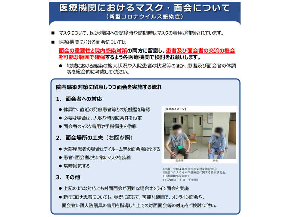 この点、厚労省は2023年10月20日に事務連絡「新型コロナウイルス感染症の対応に関する医療機関向けの啓発資材について」を示し、面会については「その重要性(患者の精神的安定の確保など)」と「院内感染対策」の両方に留意しながら、患者・面会者の体調等を総合的に考慮した上で「患者・面会者の交流の機会」を各医療機関で確保することとしています(厚労省サイトは:こちら(事務連絡)とこちら(別添))。