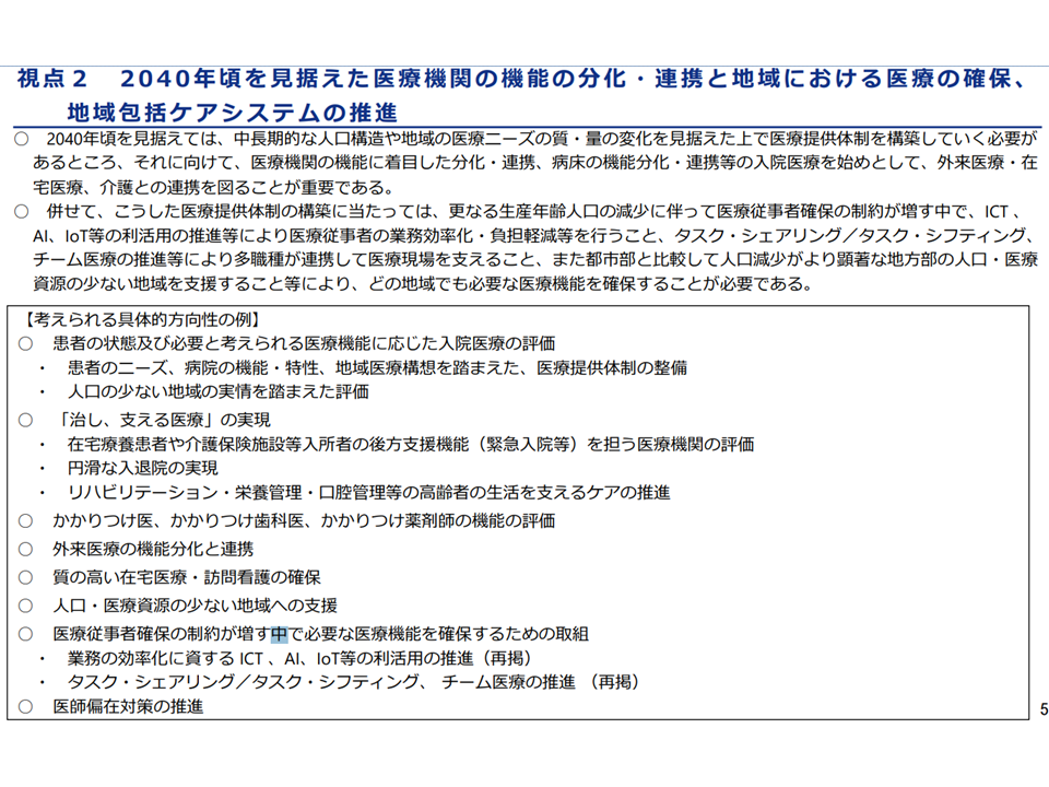 【視点2】2040年頃を見据えた医療機関の機能の分化・連携と地域における医療の確保、地域包括ケアシステムの推進