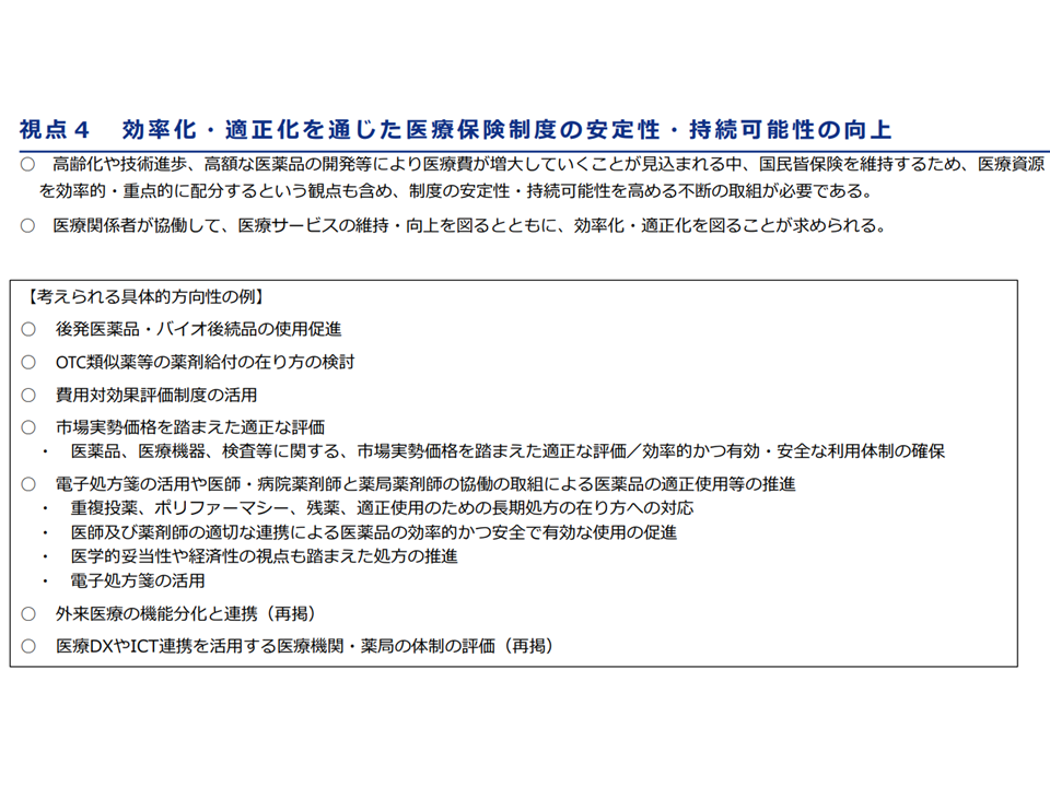 なお、【視点4】「効率化・適正化を通じた医療保険制度の安定性・持続可能性の向上」の具体的方向成案の中に「OTC類似薬等の薬剤給付の在り方の検討」という事項が盛り込まれています。