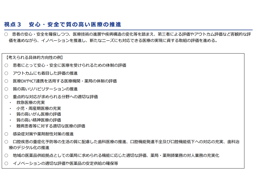 まず基本認識としては、▼物価・賃金の上昇、人口構造の変化や人口減少の中での人材確保、 現役世代の負担の抑制努力の必要性(医療分野は公定価格であるため経済社会情勢の変化に機動的な対応を行うことが難しく、医療機関等の経営の安定や現場で働く幅広い職種の賃上げに確実につながる的確な対応が必要な状況である。骨太方針2025では「高齢化による増加分に相当する伸びに経済・物価動向等を踏まえた対応に相当する増加分を加算する」としている)▼2040年頃を見据えた、全ての地域・世代の患者が適切に医療を受けることが可能かつ、医療従事者も持続可能な働き方を確保できる医療提供体制の構築▼医療の高度化や医療DX、イノベーションの推進等による、安心・安全で質の高い医療の実現▼社会保障制度の安定性・持続可能性の確保、経済・財政との調和(経済・財政との調和を図りつつ、限られた人材の中で、より効率的・効果的な医療政策を実現するとともに、国民の制度に対する納得感を高めることが不可欠である。さらなる適正化、医療資源の効率的・重点的な配分、医療分野におけるイノベーションの評価等を通じた経済成長への貢献を図る)—の4点が打ち出されました。
