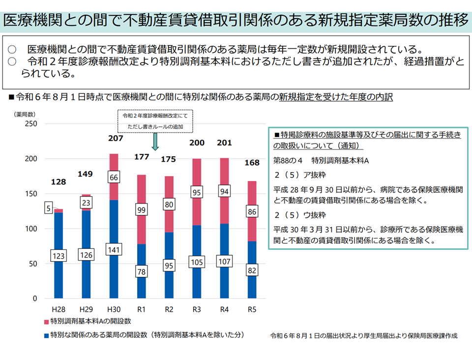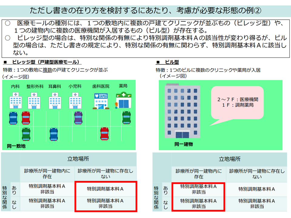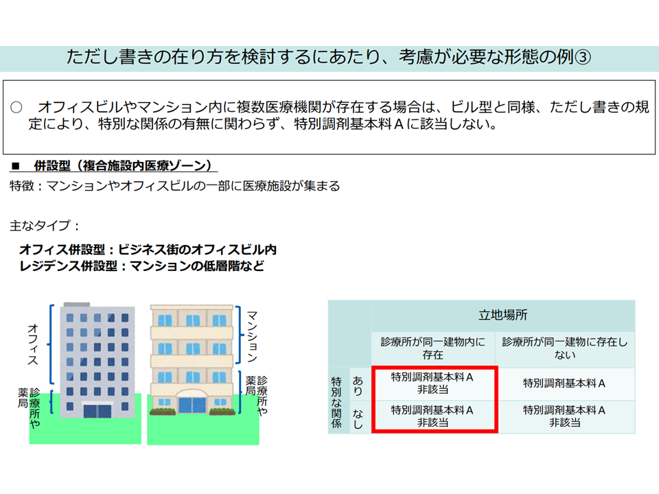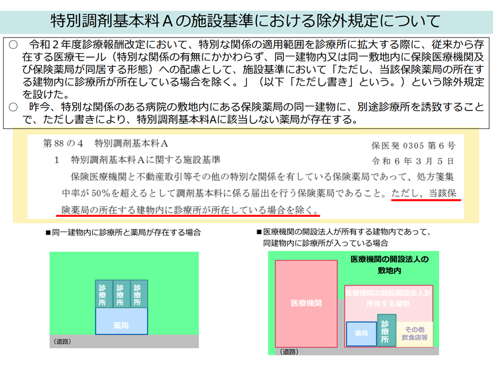 しかし昨今、このルールを「抜け道」的に使い(悪用と指摘する識者もいる)、「特別な関係のある病院の敷地内にある保険薬局の同一建物に、別途、診療所を誘致する」ことで特別調剤基本料Aの適用除外を受けるケースが散見されています。