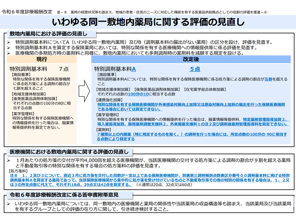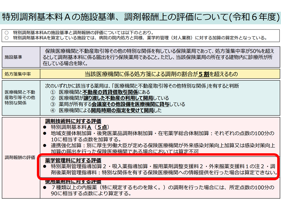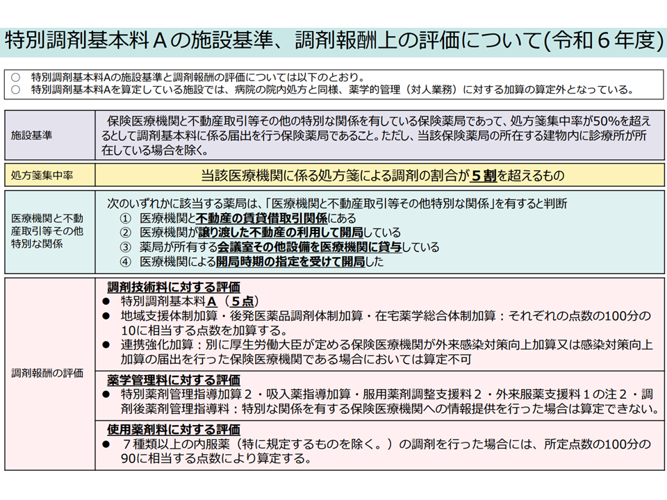 敷地内薬局には、例えば以下のような問題があるため「厳しい対応」が図られてきており、2024年度診療報酬改定では「特別調剤基本料A」(5点)という低い基本料を算定することとされました(通常の薬局は45点)。