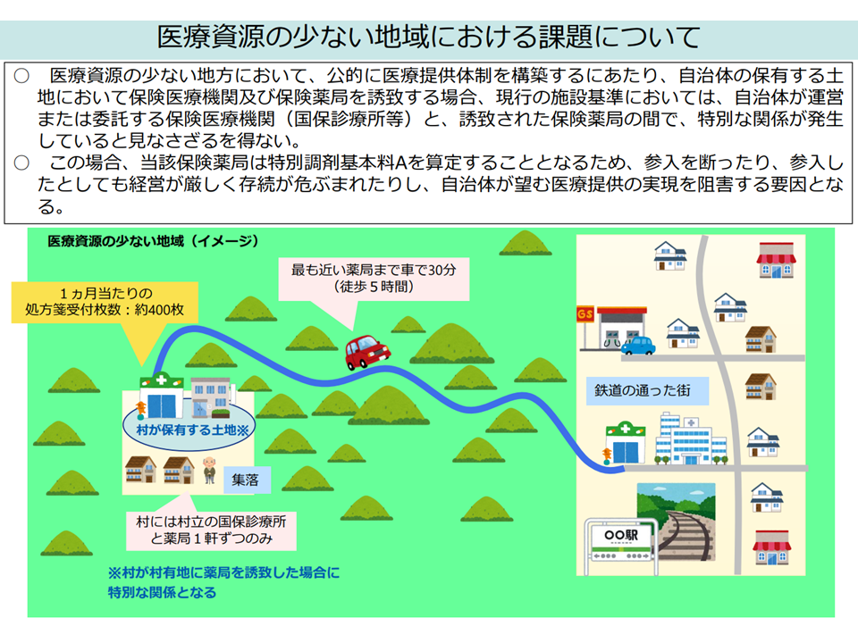 離島等で薬局を行政が誘致する場合などには「敷地内薬局と扱わない」特別ルールを検討
