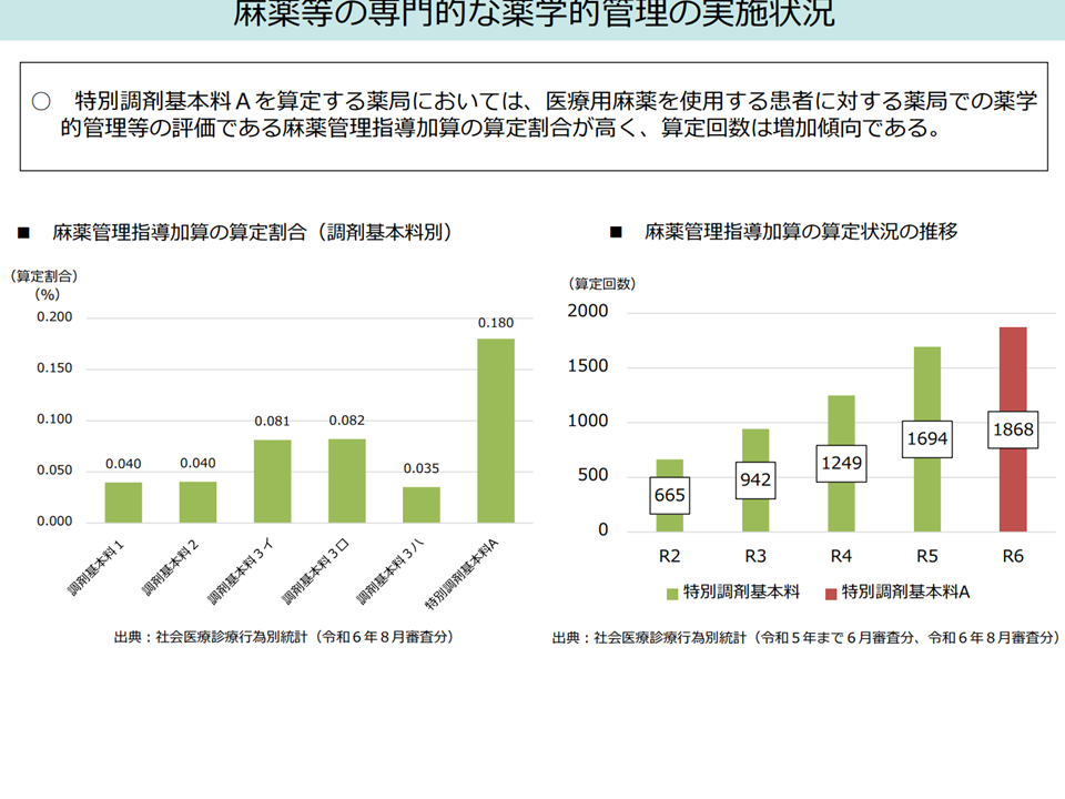 ▽特別調剤基本料A算定薬局では、医療用麻薬を使用する患者に対する薬学的管理等の評価である【麻薬管理指導加算】の算定割合が高く、しかも増加傾向にある
