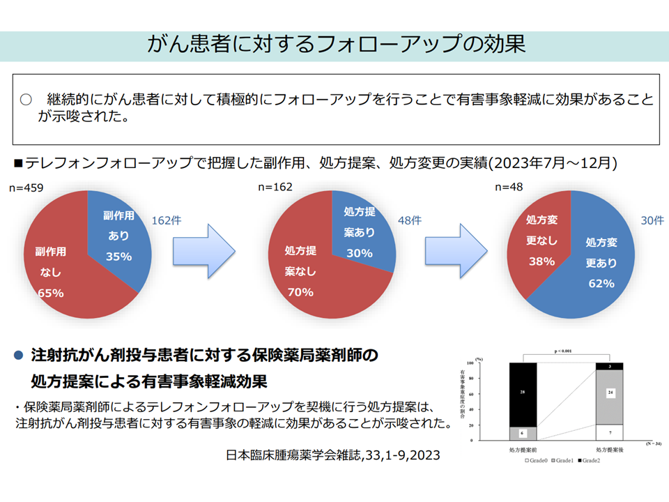 →抗がん剤使用患者について、保険薬局が薬学的管理、指導・服用状況、副作用の有無等について患者に確認し、医療機関に情報提供を行うことを評価する