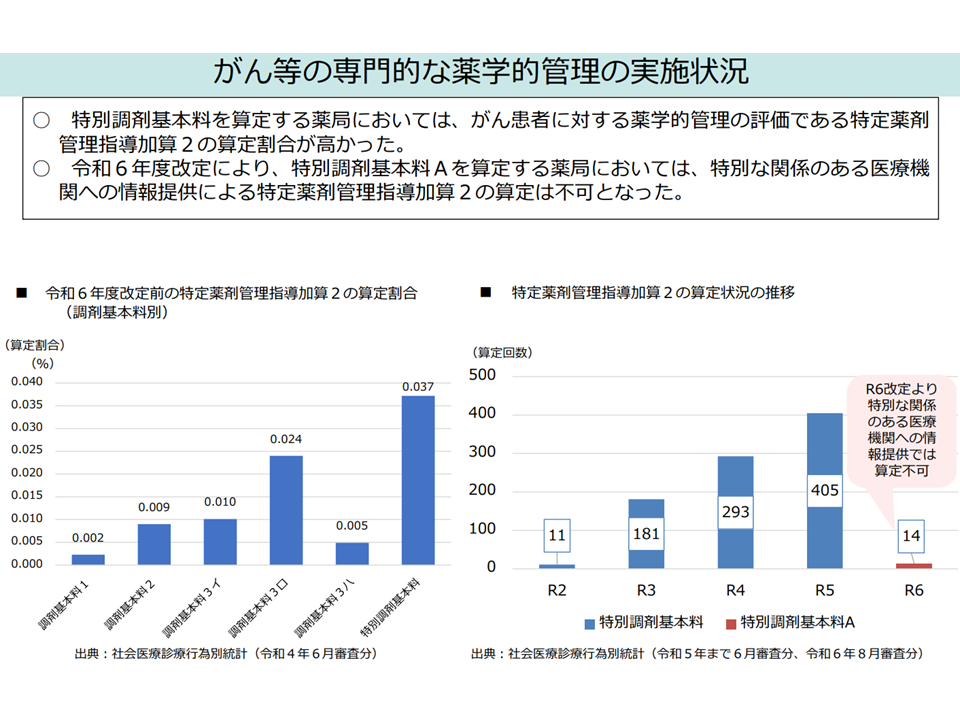 しかし中医協委員からは、▼薬学管理の重要性はどの薬局でも同じであり、高機能病院の敷地内薬局で「高度な薬学管理が求められる」ことも当然である。現在のルール(算定不可)を継続すべき(森委員)▼敷地内薬局と医療機関との関連性を踏まえたルールであり、そこでは「抗がん剤治療」なども想定しているはずである。現在のルール(算定不可)を継続すべき(江澤委員)▼特別調剤基本料A算定薬局では「専門性が高い」ことも事実である。がん患者のフォローの必要性など、個別の加算等について評価の妥当性(算定不可→算定可への見直しなど)を検討すべき(松本委員)—といった声が出ています。