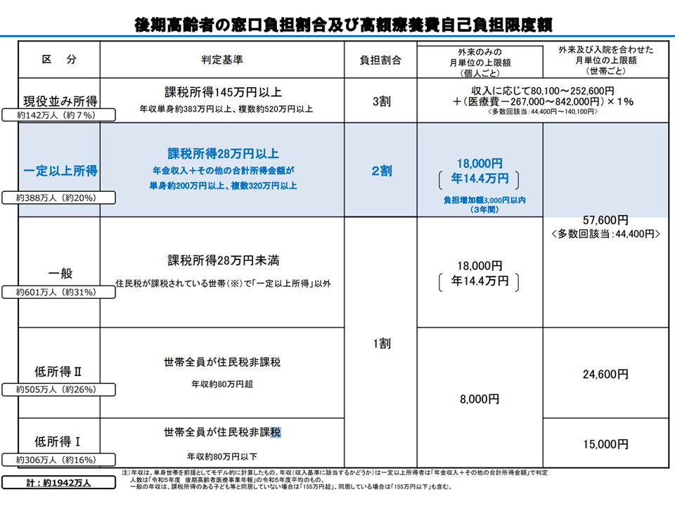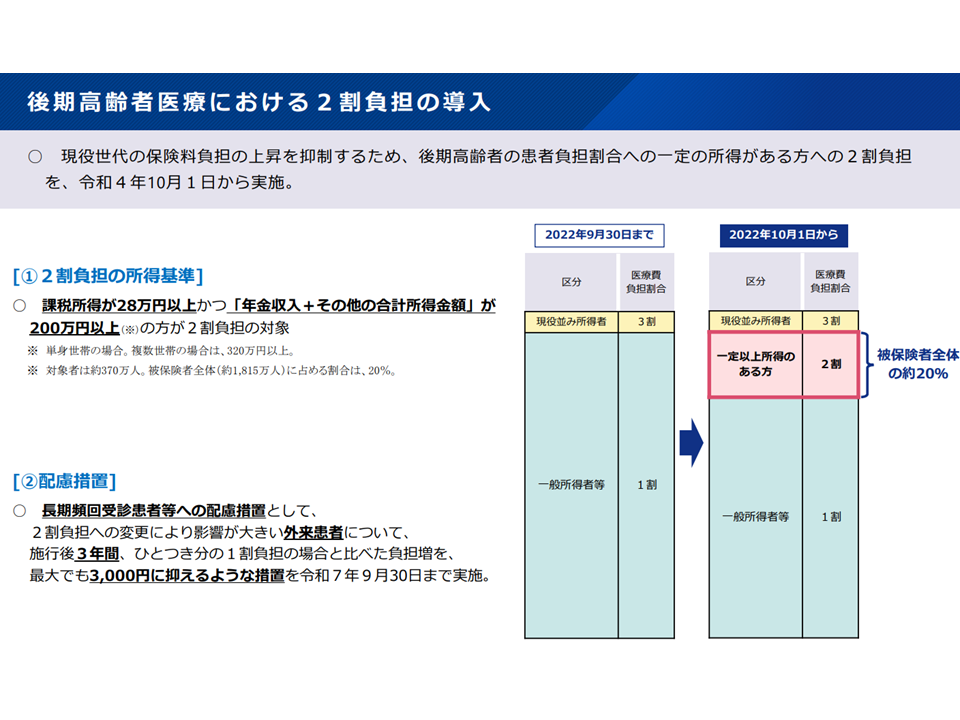 現在の後期高齢者医療制度では、患者の一部負担(医療機関の窓口支い)は「原則として医療費の1割」とされていますが、一定以上所得者では「2割負担」、現役並み所得者は「3割」となっています。