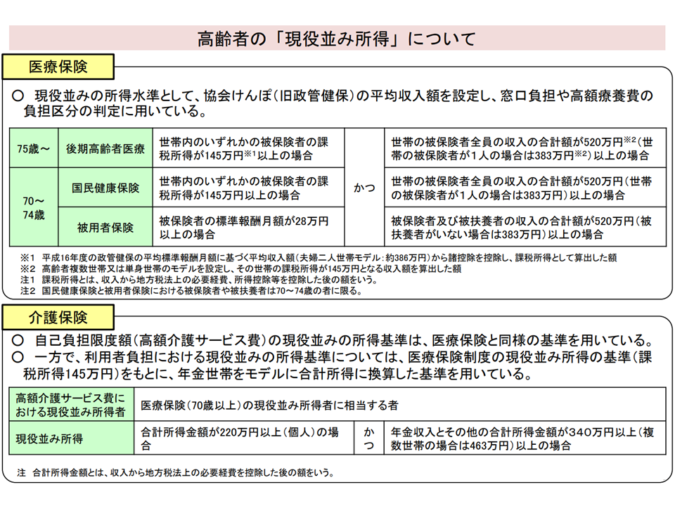 (2)3割負担となる高齢者の要件である「現役並み所得」の判断基準は2006年から見直されておらず、「改革工程」で「年齢に関わりなく、能力に応じて支え合うという観点から見直し等について検討を行う」とされているところ、現役世代の収入や社会保険料負担が上昇傾向であること等を踏まえてそのあり方をどう考えるか