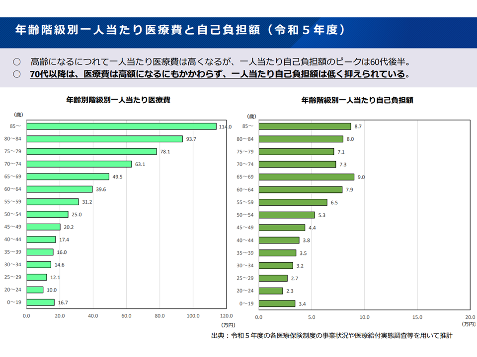 (c)70代以降、医療費は高額になるが、自己負担額は低く抑えられている