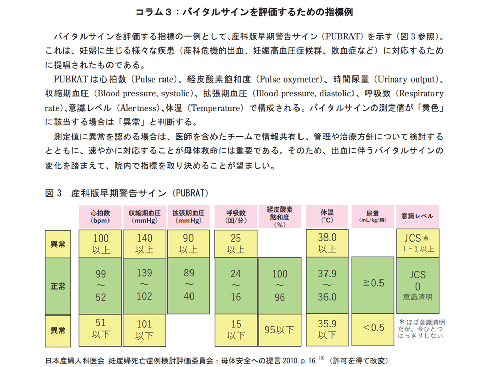 とりわけ(1)では、すべての産婦に対して、児娩出直後からバイタルサインと出血量を経時的に測定し、その推移を総合的に評価することで、「出血に伴う異常」を早期に認知する必要がある—。