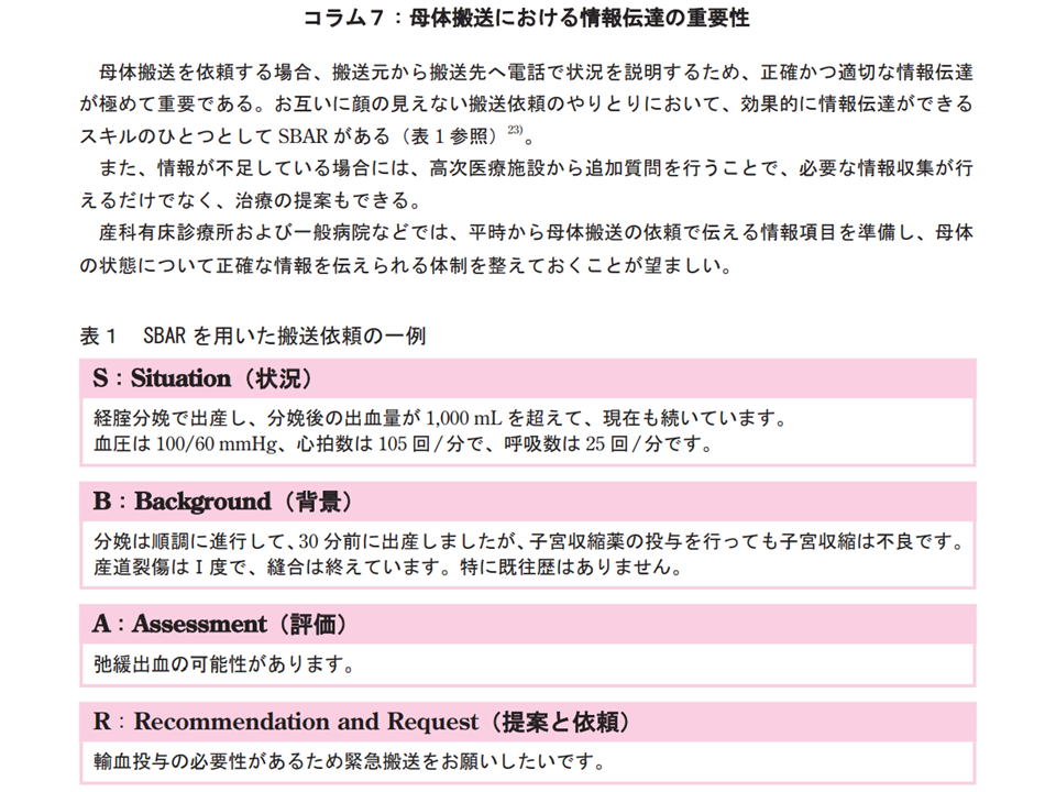 あわせて、「産科有床診療所・一般病院→高次医療機関への母体搬送」において、▼Situation(状況)▼Background(背景)▼Assessment(評価)▼Recommendation and Request(提案と依頼)—に関する情報伝達が非常に重要になることも強調しています。