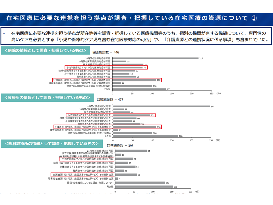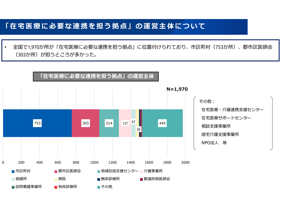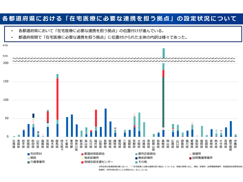 ただし、「在宅医療に必要な連携を担う拠点」の活用状況に、地域間で温度差がある、【在宅医療において積極的役割を担う医療機関】、病院・診療所「以外」指定されているケースがある、といった課題もあり、今後、どういった対応が考えられるか—。