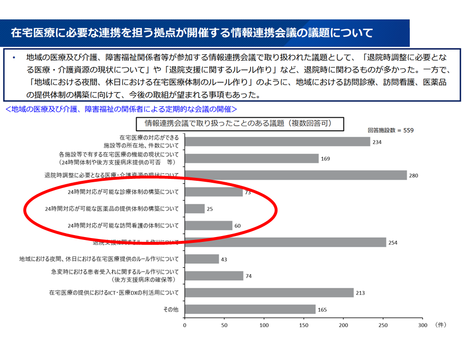▽地域の医療・介護・障害福祉関係者等の情報連携会議では、「退院時調整に必要となる医療・介護資源の現状把握」や「退院支援に関するルール作り」などを議題にするケースが多いが、「地域における夜間、休日における在宅医療体制のルール作り」などはまだ少ない