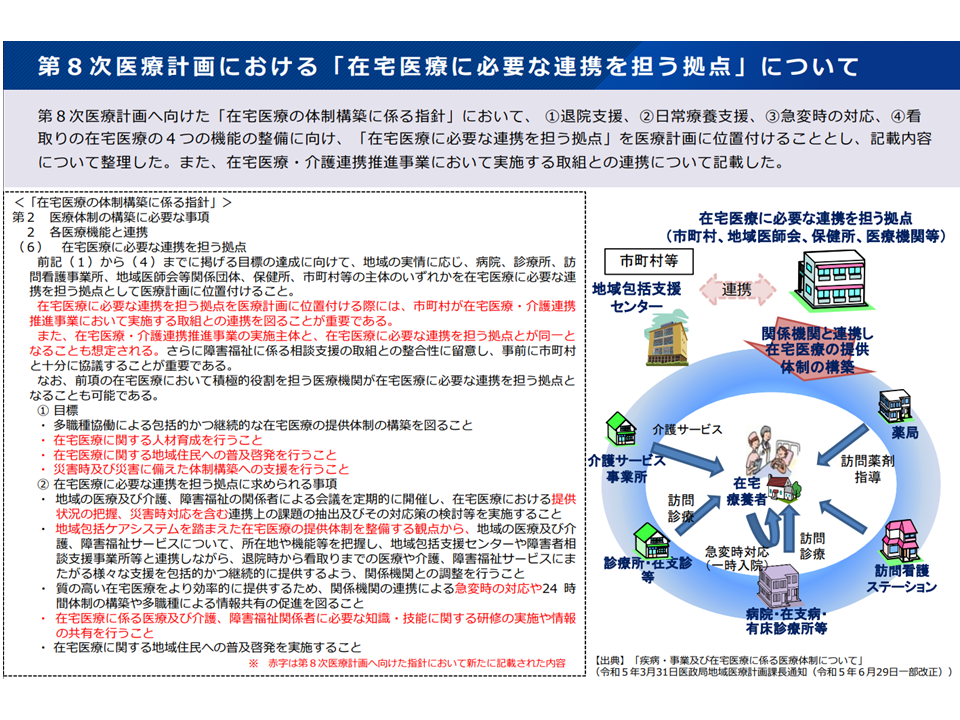 高齢化の進展とともに、在宅医療、医療・介護連携の重要性が増していく中で、地域における在宅医療提供体制をより充実し、かつ効率化する必要がある。このため各都道府県が定める「在宅医療整備計画」(医療計画の一部)には【在宅医療において積極的役割を担う医療機関】や【在宅医療に必要な連携を担う拠点】を位置づけることとなっている—。
