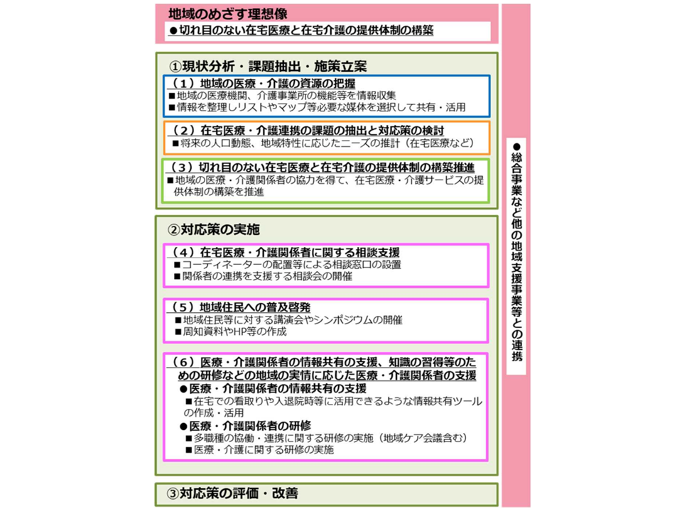在宅医療・介護連携推進事業は、名称どおり「地域の在宅医療・在宅介護の連携を強化する」ことを目指すもので、市町村に対し▼地域の医療・介護の資源の把握(医療機関や介護事業所のリスト・マップ作成等)▼在宅医療・介護連携の課題抽出と対応策の検討(地域の医療・介護関係者等が参画する会議の開催等)▼切れ目のない在宅医療と介護の提供体制の構築の推進(高齢者施設と医療機関の連携に係るマッチング等)—などを求めています。