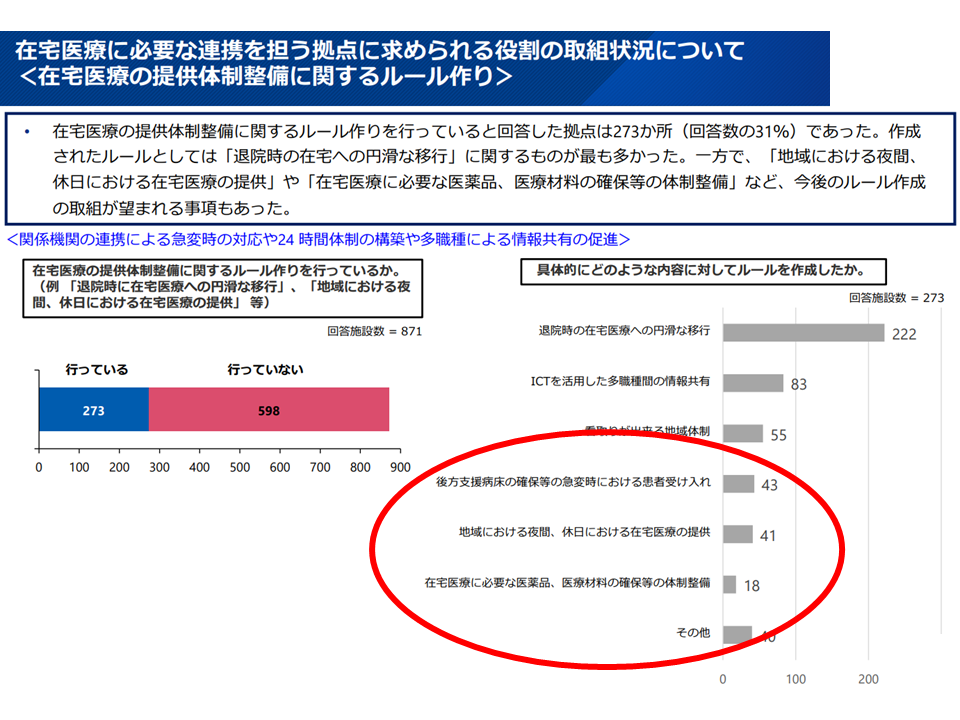 ▽「在宅医療の提供体制整備に関するルール作り」を行っている拠点は少数派(31%)で、「退院時の在宅への円滑な移行」に関するルール作りは進んでいるが、「地域における夜間、休日における在宅医療の提供」や「在宅医療に必要な医薬品、医療材料の確保等の体制整備」などのルール作りは十分に進んでいない