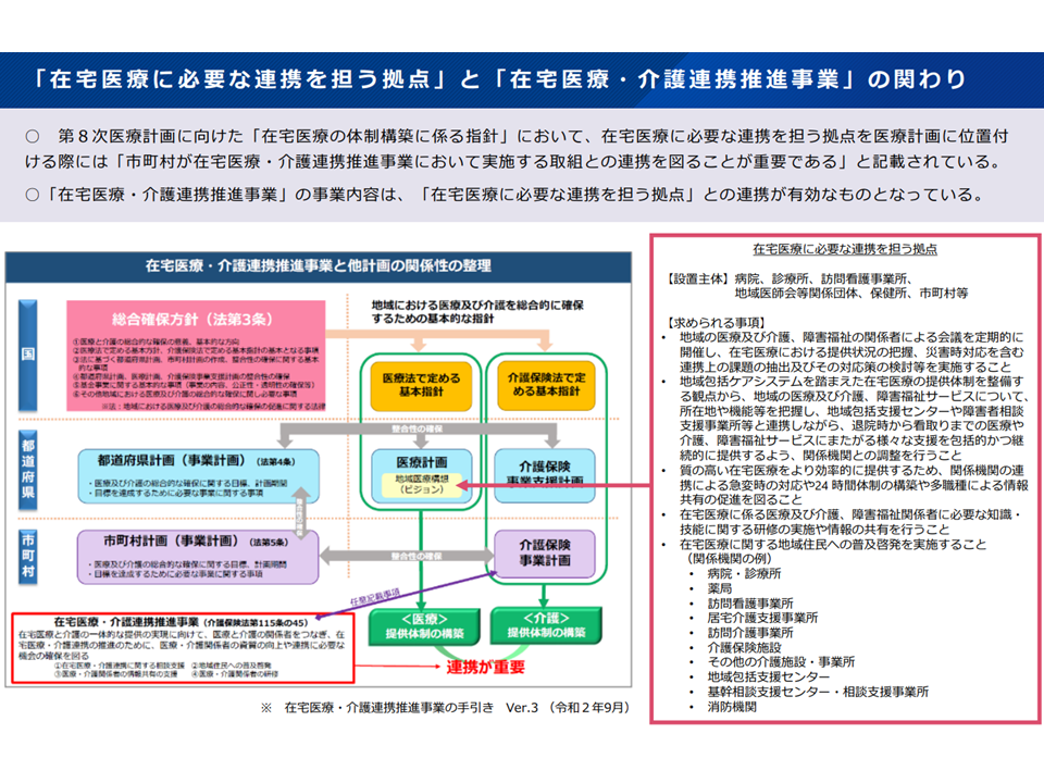 もっとも機能が重複することから、「在宅医療に必要な連携を担う拠点」と「在宅医療・介護連携推進事業」とが十分に連携し、効果的・効率的に事業展開していくことに期待が集まります。
