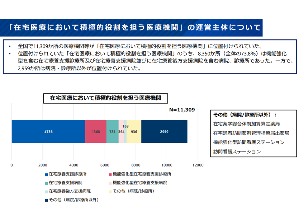 ▽全国で1万1309か所の医療機関等が「在宅医療において積極的役割を担う医療機関」に位置付けられており、8350か所・73.8%が「機能強化型を含む在宅療養支援診療所、在宅療養支援病院、在宅療養後方支援病院を含む病院、診療所」だが、2959か所・26.2%は「病院・診療所『以外』」であった