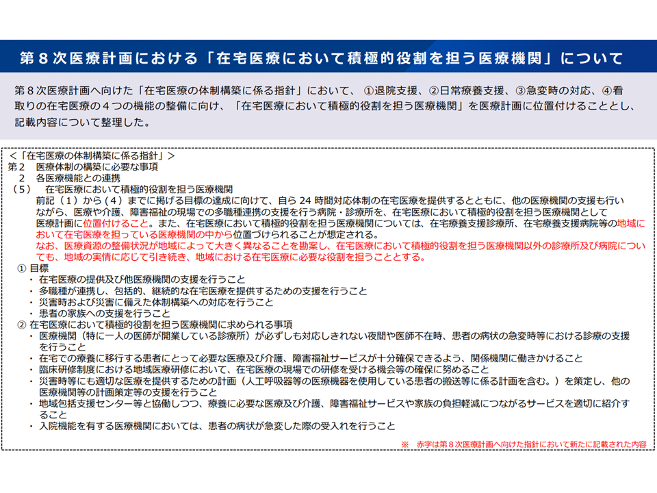 また(2)の「在宅医療において積極的役割を担う医療機関」について、指針では「在支診・病等」(病院または診療所)を想定し、▼自ら24時間対応体制の在宅医療を提供する▼他の在宅医療提供医療機関を支援する▼医療、介護、障害福祉の現場での多職種連携を支援する—ことを求めています。