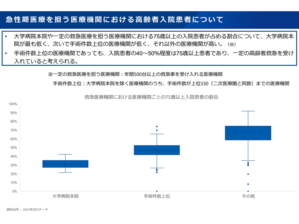 もっとも、「医育および広域診療機能に該当する大学病院本院」や、「急性期拠点機能に該当することになると思われる手術件数の多い病院」にも、相当程度「高齢患者が入院している」状況も明らかになりました。