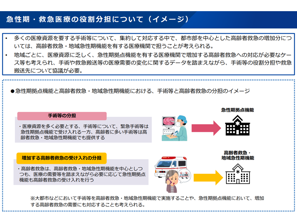 他方、「高齢者救急・地域急性期機能」は、「高齢者をはじめとした救急搬送を受け入れるとともに、必要に応じて専門病院や施設等と協力・連携しながら入院早期からのリハビリ・退院調整等を行い、早期の退院につなげ、退院後のリハビリ等の提供を確保する」機能とされています。