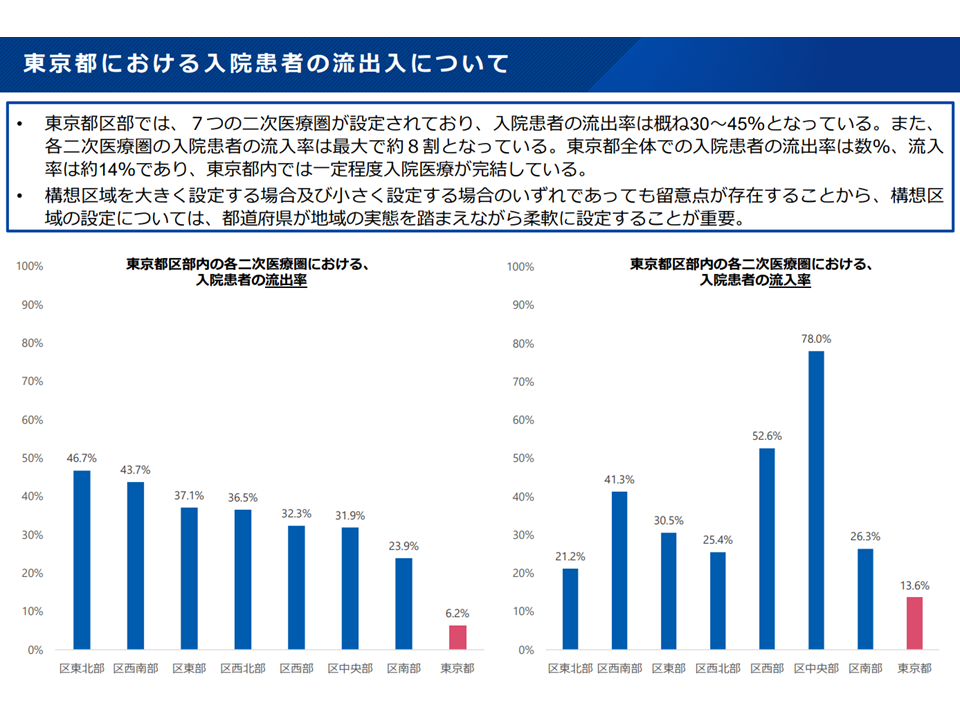 一方、東京都区部(23区)を見ると、「区中央部(千代田区、中央区、港区、文京区、台東区、大学病院が多数設定されている)への流入が非常に多い」(80%近い)一方で、「都全体では流入・流出は取り立てて多くない」ことが分かりました。上記の(a)(b)の点で問題がないのであれば、「東京都全体を1つの構想区域として検討する」ことも考えられそうです。