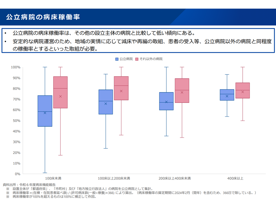 小規模病院については「自治体病院は不採算地域にあり、患者数も少ないので、必然的に稼働率が低くなる」が、「民間病院等では、経営が成り立たないために不採算地域に存在せず(このため自治体が病院を開設している)、ほとんどは患者数の多い地域に存在している」点を考慮すれば、「自治体病院で稼働率が低くなる」点には一定程度理解できます。