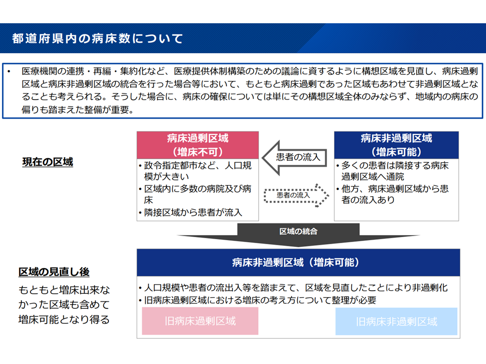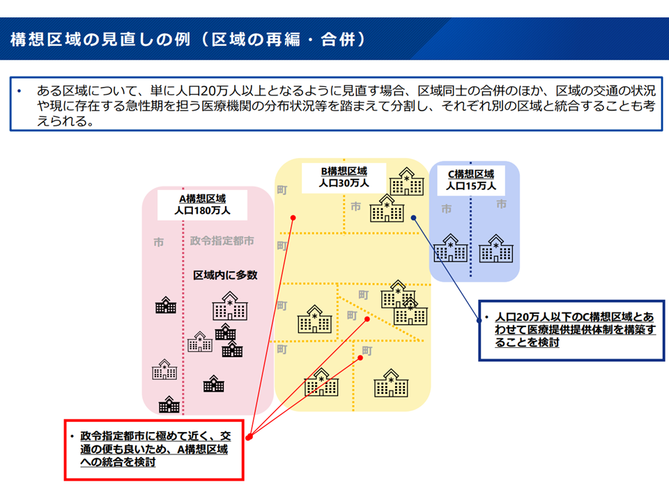 さらに今般、より詳細に「区域同士の合併のほか、区域の交通の状況や現に存在する急性期病院の分布状況等を踏まえて『分割』し、それぞれ別の区域と統合する」パターンもありうるとの考えを示しました。