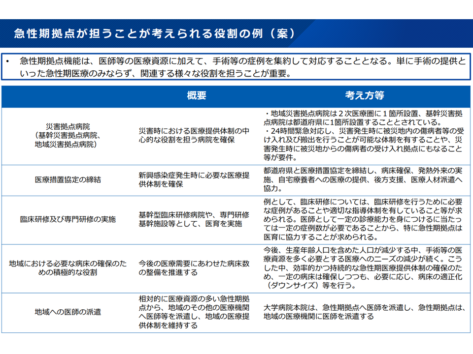 このうち「急性期拠点機能」は、「地域での持続可能な医療従事者の働き方や医療の質の確保に資するよう、手術や救急医療等の医療資源を多く要する症例を集約化した医療提供を行う」機能とされ、この機能に照らして次のような考え方が示されました。