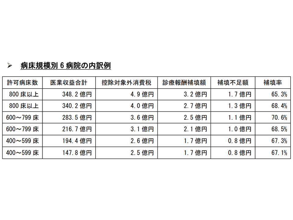 病院の消費税負担状況を調査したところ、例えば大規模急性期病院では、診療報酬による補填割合は68.4%にとどまり、2億円近い「村税」も発生している—。