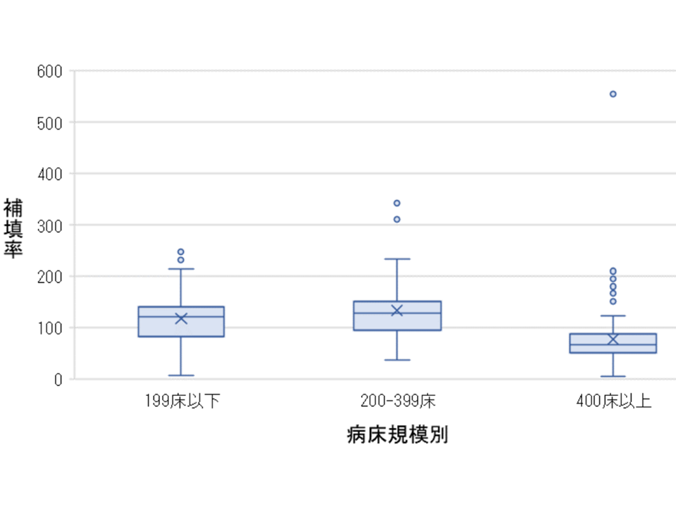 ▽補填率の平均値は105.0%、中央値は96.1%であった(補填率が低い、補填不足で損税となっている病院が多数に上ることがわかる)
