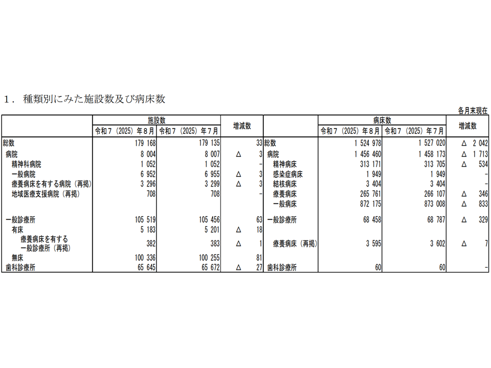 本年(2025年)8月末の医療施設数を見ると、全国では17万9168施設で、前月末(2025年7月末)から33施設増加しました。
