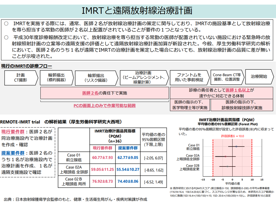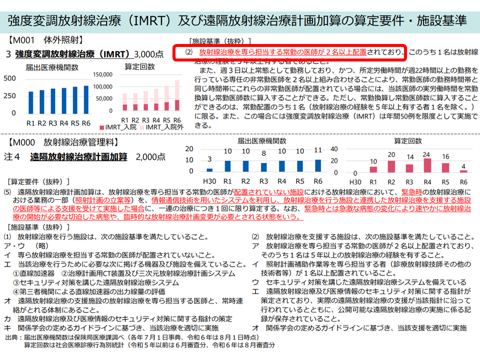 (3)M001【体外照射】の「3 強度変調放射線治療(IMRT)」(3000点)では「放射線治療を専ら担当する常勤医師2名以上配置」を施設基準としているが、▼放射線治療を専ら担当する常勤の医師が「配置されていない」施設における緊急時の放射線照射計画立案等を評価するM000【放射線治療管理料】の【遠隔放射線治療計画加算】が設けられたこと▼「医師2名のうち1名が遠隔でIMRTの治療計画を策定した場合でも、放射線治療計画の品質に差が無い」との研究結果が得られていること—を踏まえ、医師配置要件を見直す(例えば「1名は遠隔でよしとする」など)